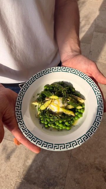 French and Italian at heart, with Mediterranean and Japanese influences and whatever the season allows. He is also a trained sommelier — the glass follows the plate.